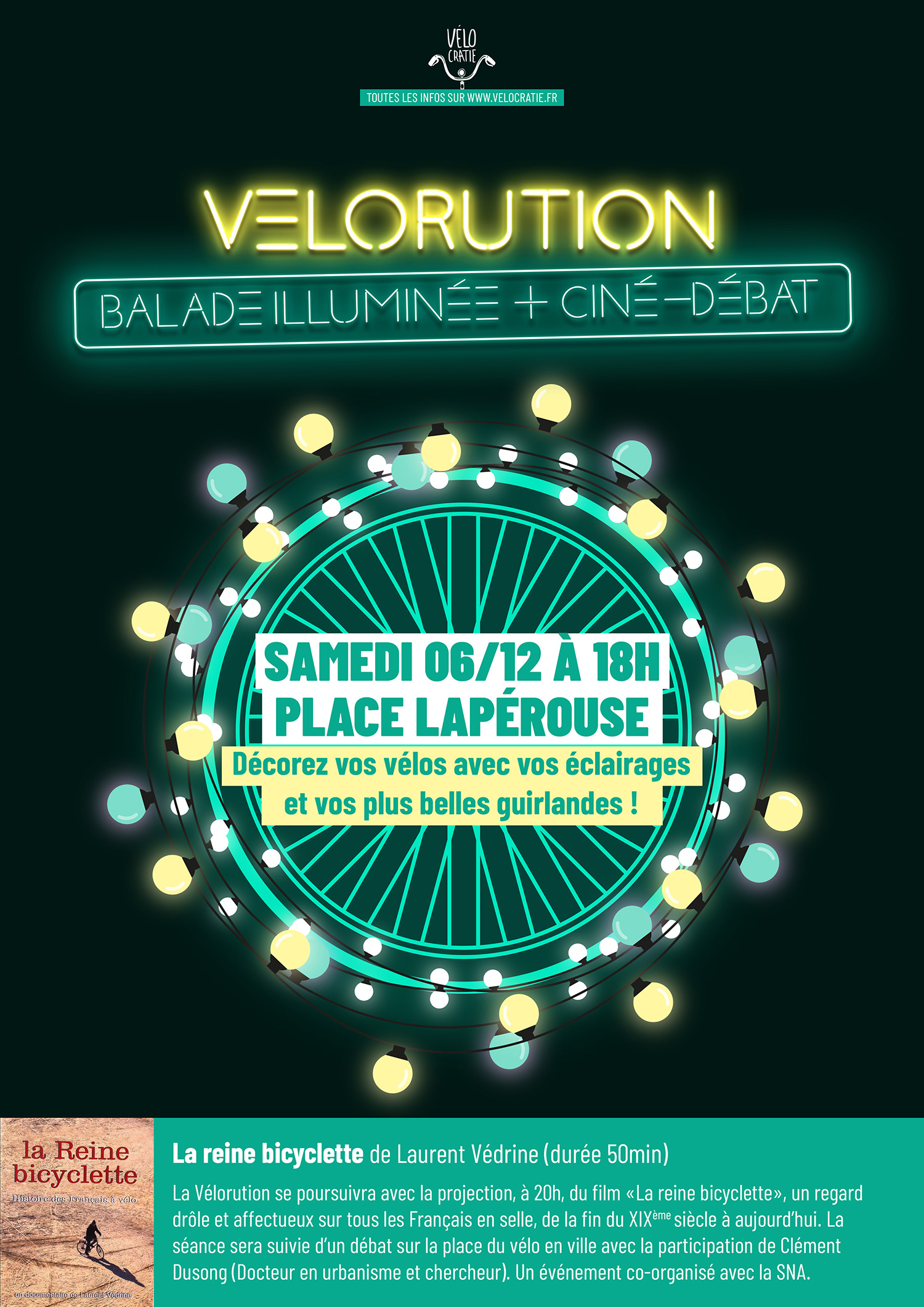 Pour l’occasion, décorez vos vélos avec vos éclairages et vos plus belles guirlandes ! Vous pourrez assister ensuite à un ciné-débat autour du vélo co-organisé avec la SNA :